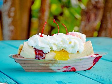 Traditional Sundaes: Two scoops of Vanilla ice cream, Ghirardelli hot fudge topped with chopped peanuts, whipped cream & a cherry. Brownie Sundaes: Fudge brownie with two scoops of vanilla ice cream, Ghirardelli hot fudge topped with chopped peanuts, whipped cream & a cherry! Banana Split: One scoop each of vanilla, chocolate and strawberry ice cream topped with Ghiradelli hot fudge, strawberry sauce pineapple sauce topped with chopped peanuts, whipped cream and a cherry. *Sundaes and banana spl