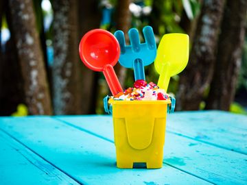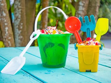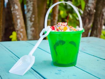 Regular: Three scoops of your choice ice cream with Ghirardelli hot fudge topped with your choice of candy topping (see list on back), whipped cream & a cherry. *includes & shovel. One scoop of your choice ice cream with Ghirardelli hot fudge topped with your choice of candy topping (see list on back), whipped cream & a cherry. *includes shovel.